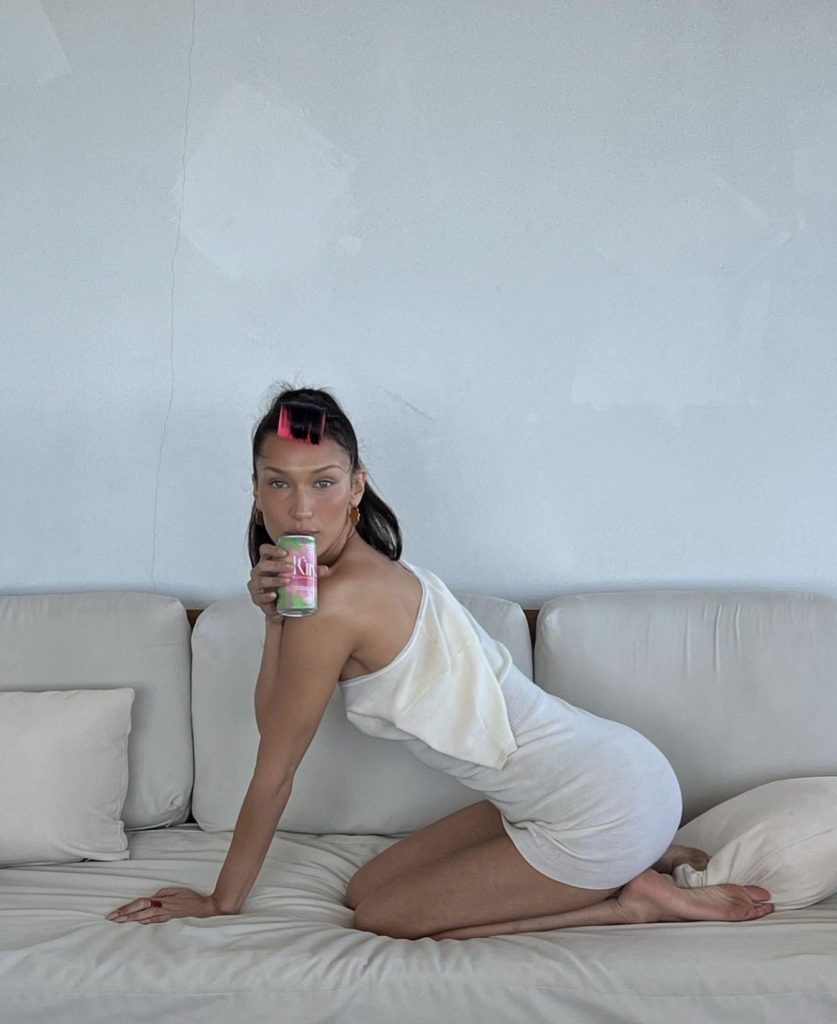 На фотографиях инфлюенсер позирует с банкой безалкогольного напитка своего бренда Kin Euphorics. И согласись: белое платье выглядело бы довольно скучно, если бы Белла не спустила одно плечо, обнажая ключицу. Перед нами отличная идея, как дать вторую жизнь вещи, завалявшейся в анналах шкафов (и избавление от необходимости бежать за новой).