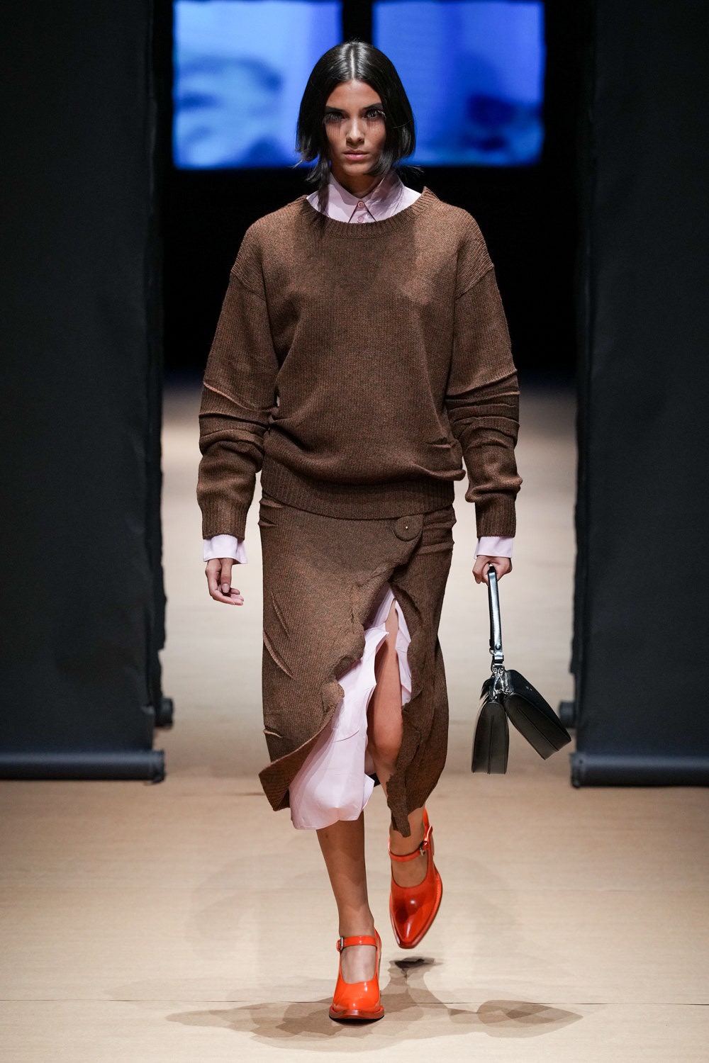 От эффекта мятой ткани на жакетах, словно ее неправильно прогладили утюгом, до прозрачных сияющих тканей на обтягивающих юбках – дизайнерский дуэт снова презентовал нескучные модные решения. К примеру, последнему примеру активно следовали и дизайнеры недавней Недели Моды в Нью-Йорке, но у Prada нашелся более креативный ответ. Дополнительно взгляд уцепился за удлиненные пиджаки и платья с бантами с длинными лентами сзади – еще одно нетрадиционное решение для вполне традиционных вещей.