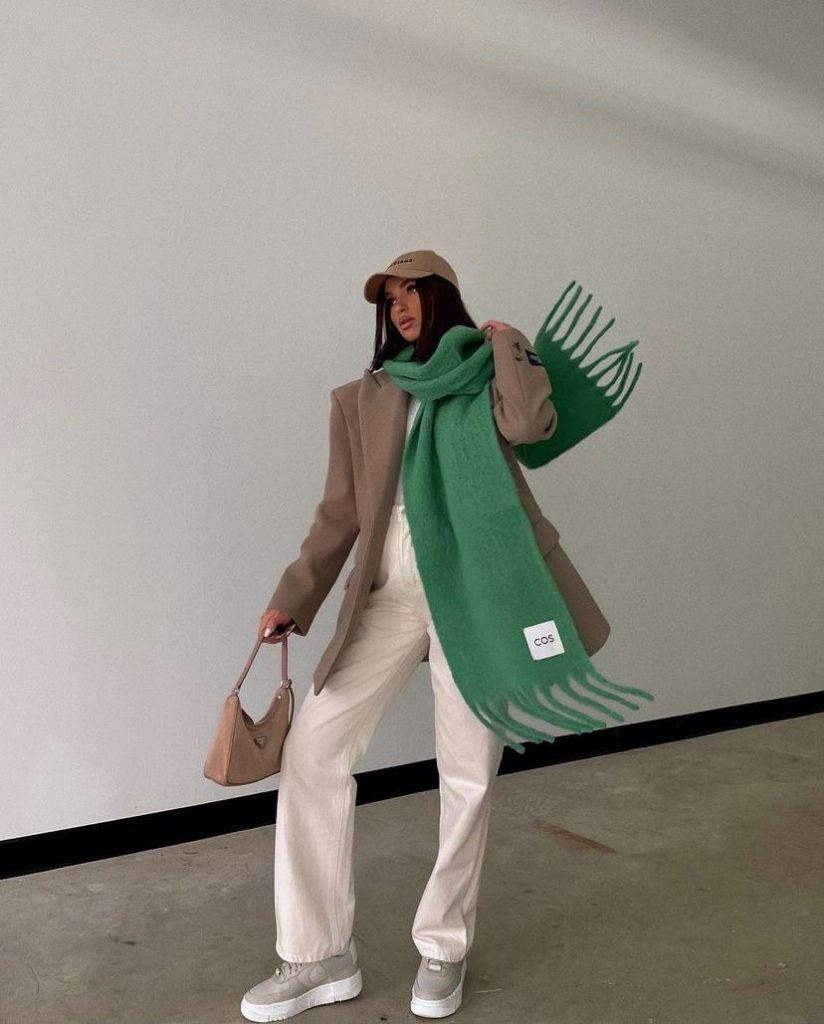Еще один любимый прием fashion-блогеров — внимание к аксессуарам. Даже черный или серый тотал-лук может стать интереснее, если дополнить его яркими деталями. Например, ярким шарфом, как в коллекциях Acne Studios или COS. Еще один вариант — перчатки и головые уборы: синие плюшевые панамы или розовые бейсболки точно не оставят без внимания твой аутфит.