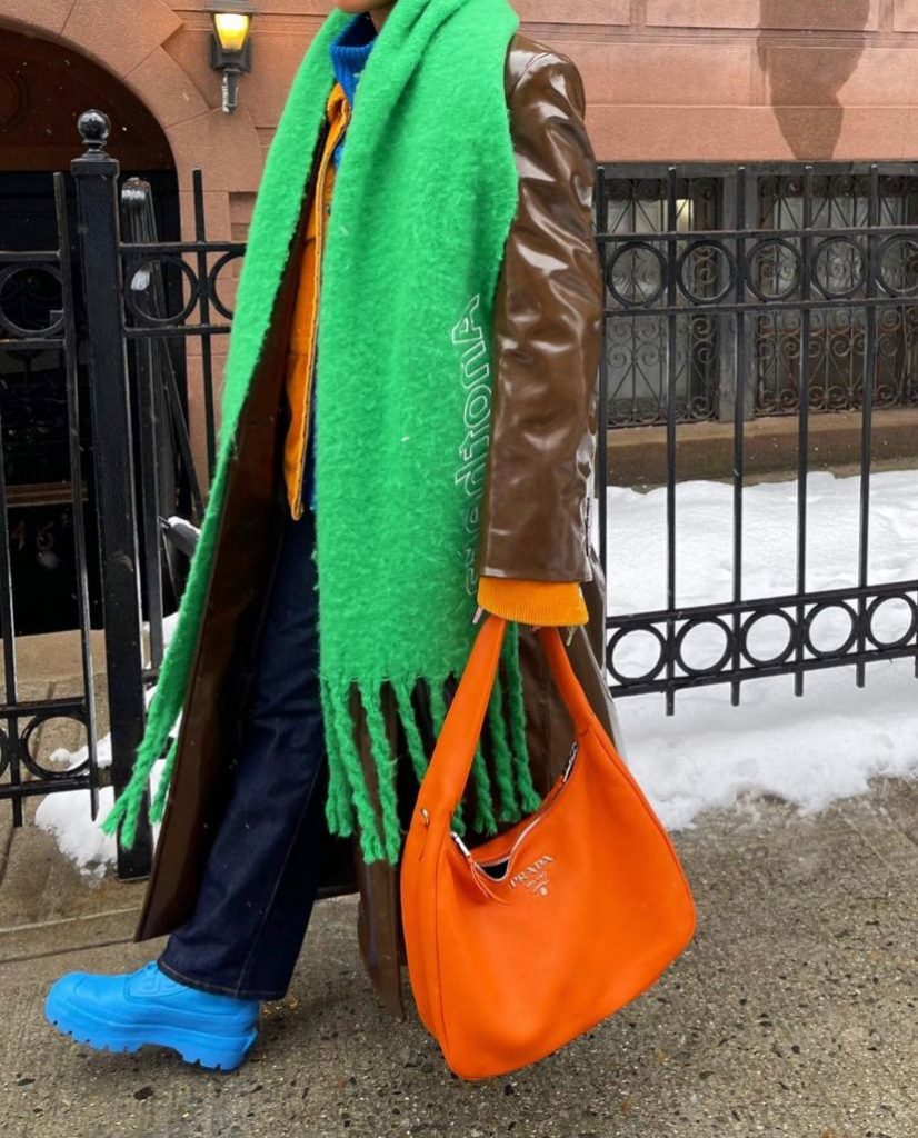Как дополнить зимний аутфит яркими деталями? Тут на помощь приходят fashion-блогеры, которые уже полюбили прием и даже придумали свои варианты. Чаще всего инфлюенсеры используют зеленый, синий, оранжевый и сиреневый цвета.