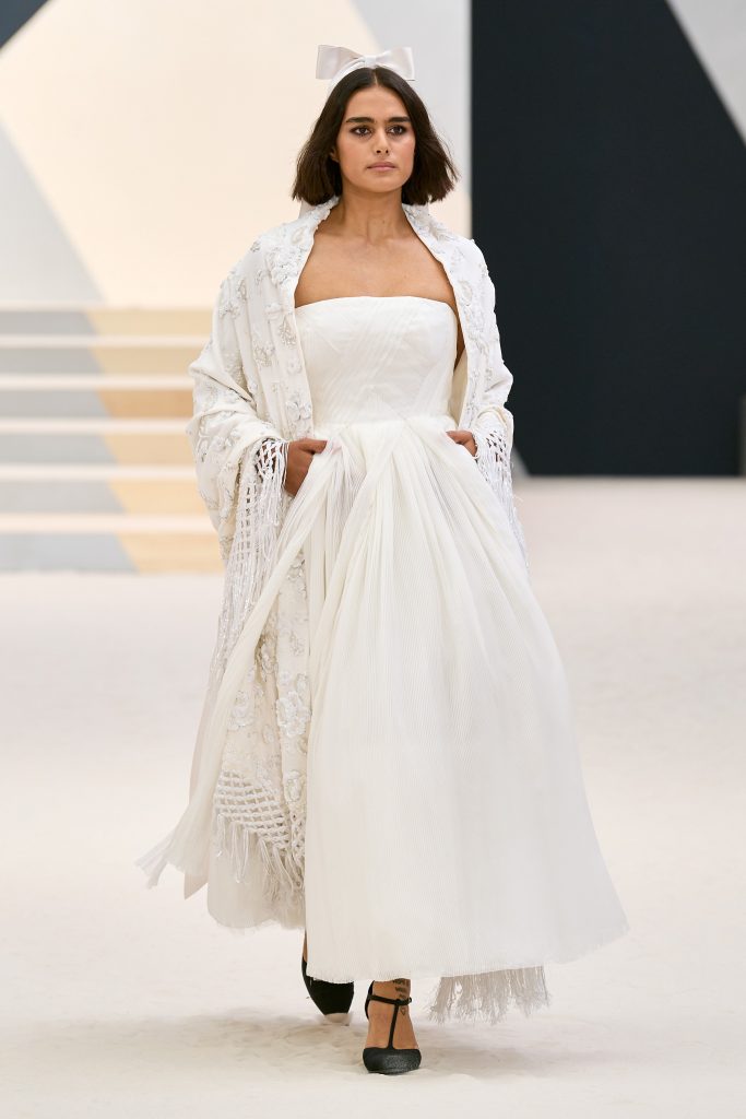 Кутюрное шоу Chanel в этот раз закрывала плюс-сайз-модель Джилл Кортлев. Она вышла на подиум в свадебном платье-бюстье, черных туфлях и накидке, расшитой бисером. «Вишенкой» образа стал минималистичный бант на голове, который заменил фату. Идеальный вариант для тех, кто ищет замену классике.