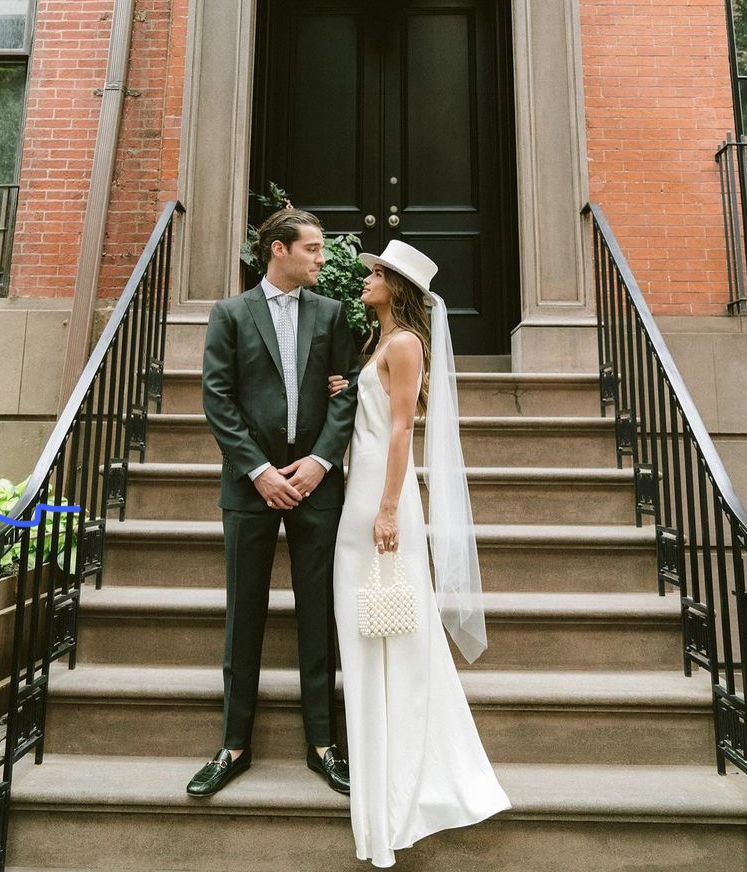 А вот интересный свадебный образ от американского блогера Роки Барнс. Классическую фату она дополнила шляпой канотье. Смотрится очень свежо и современно, особенно в сочетании с платьем-комбинацией.