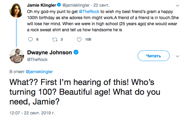 «О боже, попытка попросить Дуэйна Джонсона поздравить бабушку моей лучшей подруги с днем рождения может сработать! Один друг нашего друга на связи с ним. Она просто сойдет с ума! Когда мы учились в школе (25 лет назад), она рассказывала нам, какой он крутой».
