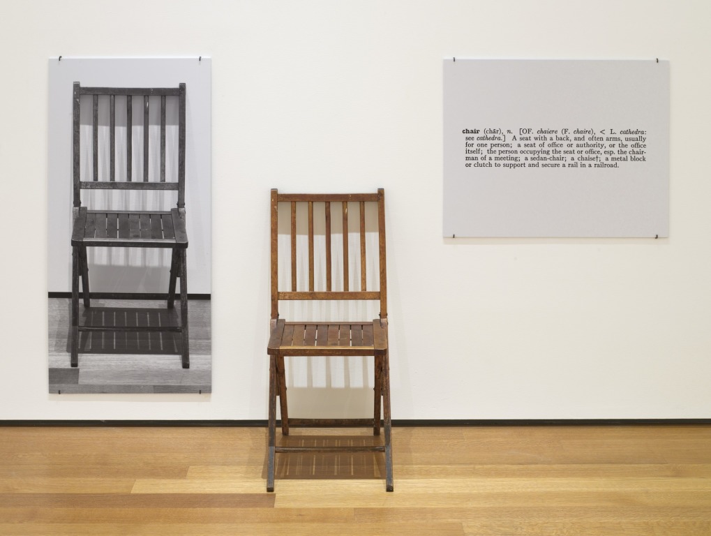Культовым образцом нового стиля стало произведение Джозефа Кошута «Один и три стула» (1965). Композиция состояла из обычного стула, его фотографии и текстового описания стула из словаря. Таким образом, самотематизирующая работа содержит в себе контекст собственной презентации. Таким образом, художники-концептуалисты сосредоточились на наделении произведений смыслами так, чтобы работа могла самостоятельно и представлять, и пояснять себя.