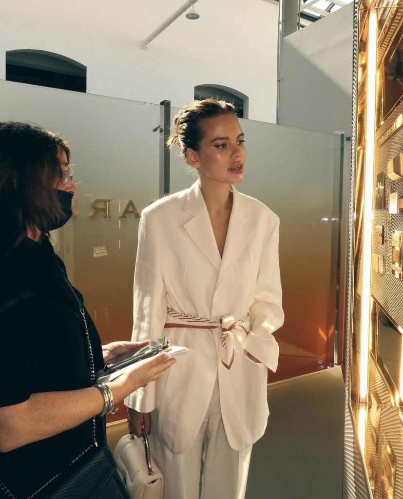 Образ Даши Клюкиной, которым мы восхищаемся всей редакцией. Белый льняной костюм она дополнила шелковым платком в качестве ремня на талии. Идеальный вариант для свидания или вечера на веранде.