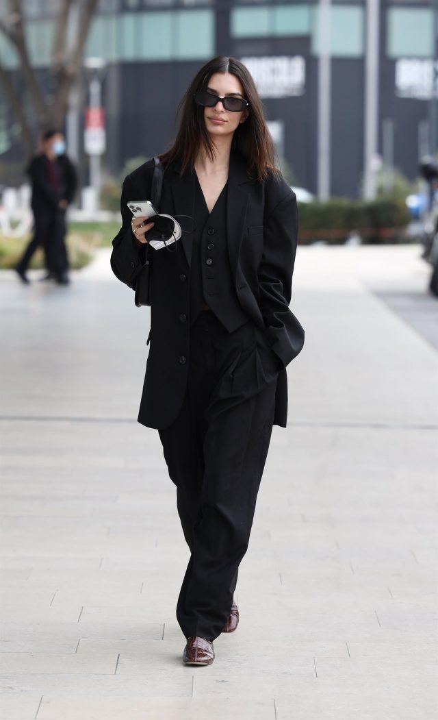 Например, вчера папарацци застали Ратаковски в Милане в черном костюме-тройке с мужского плеча. Отличный вариант, если вам хочется разбавить свой гардероб не просто oversize классикой, а чем-то более интересным. Эмили надела жакет прямо на голое тело, что придало образу расслабленности. А собрать такой аутфит не составит труда, вероятно, подобный костюм может найтись в гардеробе у вашего папы, друга или парня.