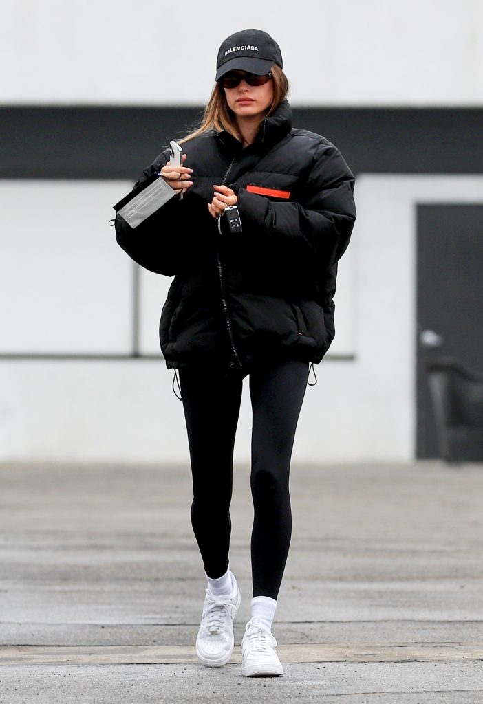 Накануне модель была замечена в Лос-Анджелесе после тренировки. Для выхода она выбрала черный пуховик из совместной коллекции Heron Preston и Calvin Klein, черные леггинсы и бейсболку Balenciaga. Total black аутфит Хейли разбавила белыми Nike Air Force.