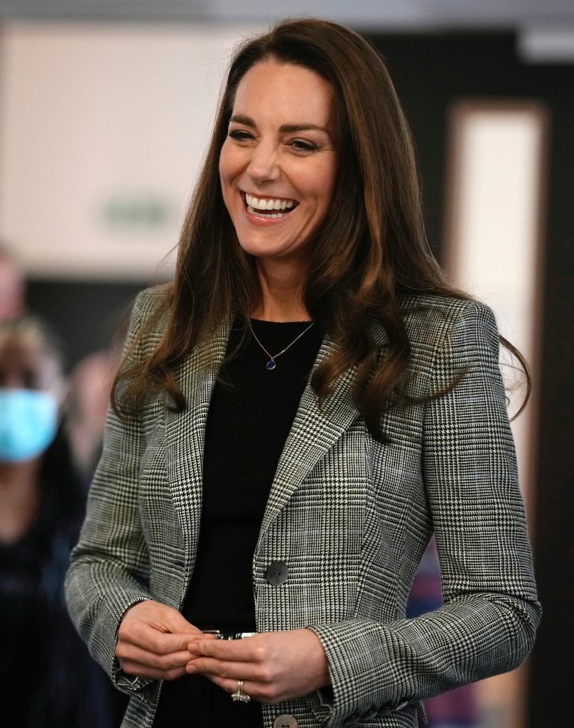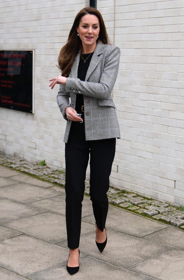 Одно из таких правил гласит — никакого черного цвета. Если вы обращали внимания, то могли заметить, что представители королевской семьи носят черный исключительно в случае траура. Кейт Миддлтон же практически полностью пренебрегла этим правилом. Единственным светлым акцентом у нее стал серый приталенный жакет Smythe.