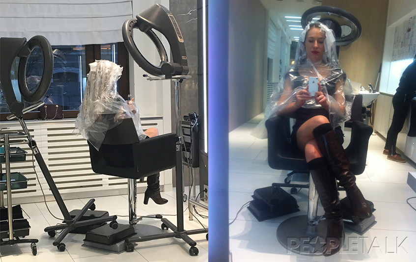 Затем началась небольшая суета, когда выяснилось, что необходимого средства для смывания цвета в салоне нет и придется смывать чем-то другим, да и времени у VIP-стилиста мало, хотя я была записана заранее. В итоге решили, что мною будут заниматься по мере возможности и передавать из рук в руки, как эстафетную палочку, но, по заверениям управляющего, «под чутким руководством VIP-стилиста». Я с пониманием отнеслась к ситуации, ведь, как мне сказали, это один из лучших стилистов столицы и ради услуг такого мастера стоит потерпеть маленькие неудобства. Но когда помощница VIP-стилиста, нанося средство для обесцвечивания волос, с нескрываемым сарказмом сказала: «Ох, любите вы свои волосы, раз так мучаете», доверие пошатнулось. Чтобы нанести средство жуткого синего цвета на всю мою шевелюру, они работали в тандеме. Слой за слоем «мастерицы» наносили на мои волосы обесцвечивающий состав и покрывали их пищевой пленкой. За моей спиной установили две лампы, которые грели до такой степени, что у меня пересохли глаза. Но чего не стерпишь ради такой красоты!