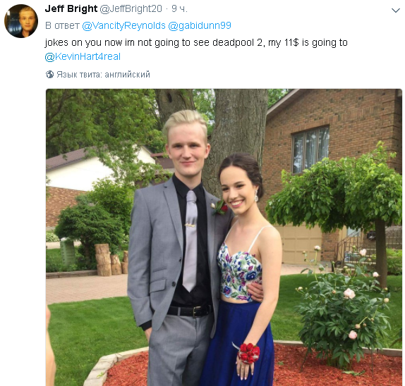 Вместо Джеффа в свои фотографии она вставила Райана Рейнольдса (40)! «Я рассталась со своим парнем через несколько дней после выпускного, так что я решила немного подкорректировать фотографии», — написала девушка под фотографиями и «отметила» Рейнольдса. И актер, который обожает общаться с поклонниками в Twitter, ей ответил! «Теперь нужно прифотошопить меня в его выпускной альбом. #НеСвязывайтесьСГаби», — пошутил Райан.