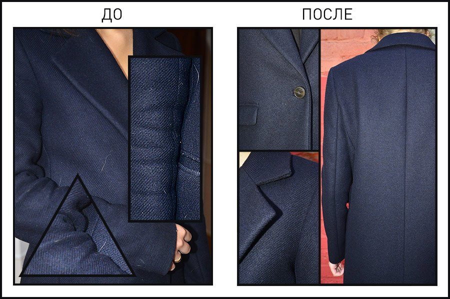 Пальто приняло первоначальную форму, а заломы на рукавах исчезли.