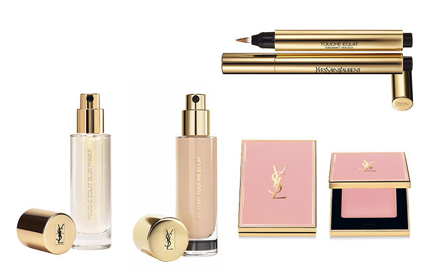 Тональный крем LE TEINT TOUCHE ECLAT №BR 30, база под макияж TOUCHE ÉCLAT BLUR PRIMER, финиш для макияжа TOUCHE ECLAT BLUR PERFECTOR от YSL и помада RPOGE PUR COUTRE №14