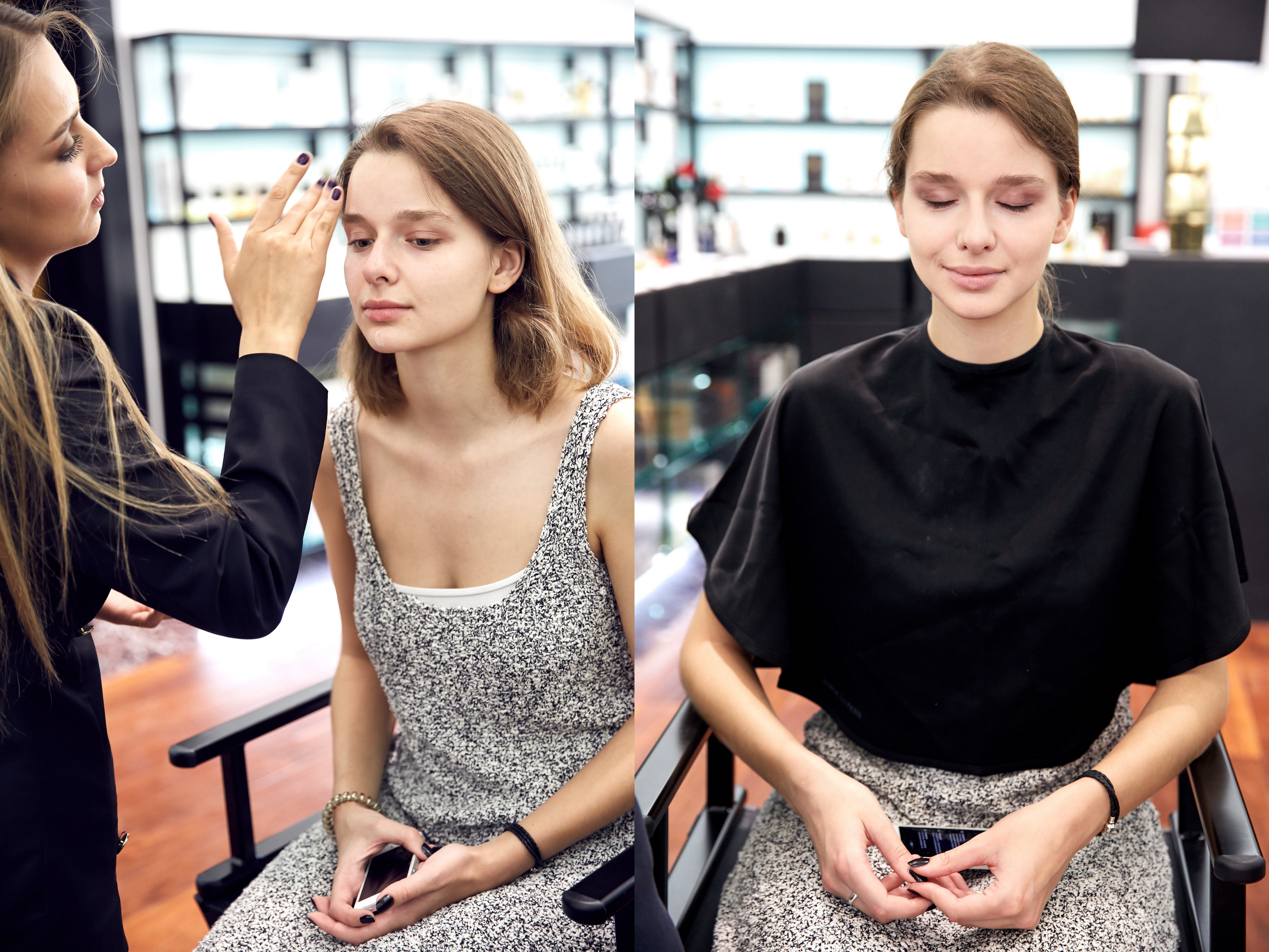 Сначала Виктория нанесла корректор на проблемные участки кожи (прыщики и круги под глазами). «Корректор нужно вбивать кончиками пальцев. Так он лучше разогревается и сливается с кожей», — объясняет она. Затем в ход пошла пудра с тающей текстурой (причем подходящий мне тон визажист определила моментально на глаз). Надо сказать, что я уже неплохо выгляжу! «У вас глубоко посажены глаза, так что теплый оттенок теней исправит это», — Виктория использует коричневый, потому что он подходит к зеленым глазам («нужно растушевать тени, чтобы глаза казались миндалевидными»), а потом одним штрихом рисует тонкие стрелки.