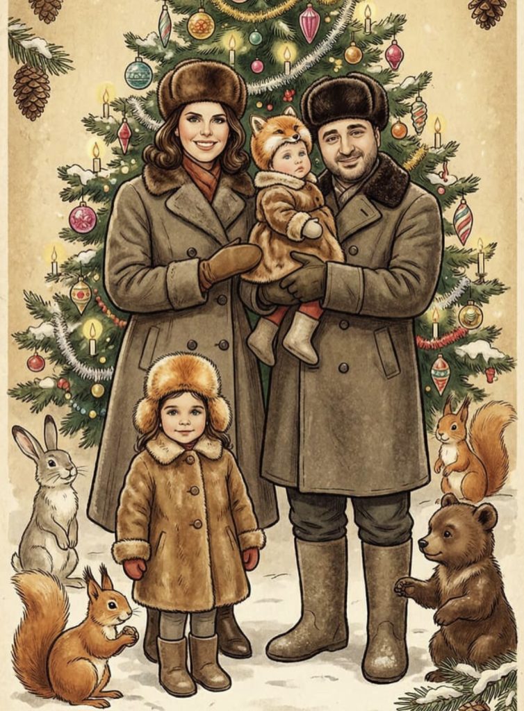 «Винтажная советская новогодняя открытка 1950-х годов, вертикальная ориентация (соотношение сторон 9:16). В центре композиции  – счастливая молодая семья: мужчина, женщина и маленький ребенок. Их лица реалистичны и выразительны, с сохранением естественных эмоций и черт. На мужчине меховая шапка из ондатры и зимнее пальто. На женщине элегантная меховая шапка из норки и зимнее пальто. На ребенке теплый винтажный зимний комбинезон. Они стоят на фоне зимнего сказочного леса, легкий снегопад. Рядом новогодняя елка, украшенная простыми советскими игрушками, еловые шишки и хвойные ветки. В сцене присутствуют милые лесные зверюшки – белочка и зайчик, в добром сказочном стиле. Светлая, мягкая цветовая палитра с пастельными оттенками. Общее настроение теплое, сказочное, новогоднее. Стиль – мягкая живопись, легкая текстура старой бумаги, легкое зерно. В нижней части открытки надпись изящным рукописным шрифтом: С Новым годом!».