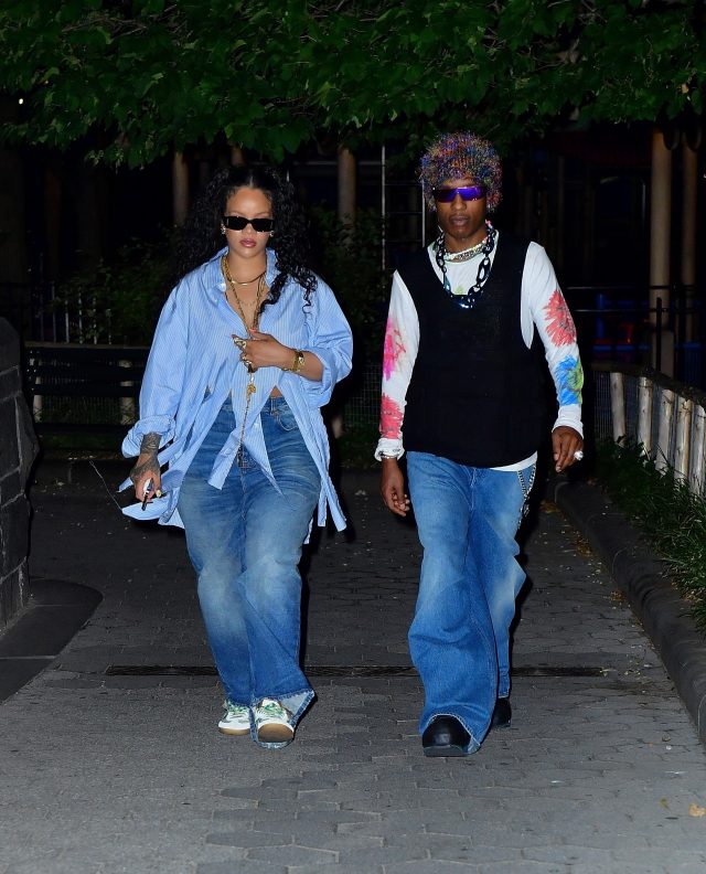 Так, накануне их с A$AP Rocky застали на прогулке по улицам Нью-Йорка. В этот раз Рианна отдала предпочтение oversize: объемные джинсы звезда сочетает с расслабленной рубашкой, немного открывающей ее талию. Раким Майерс (наст. имя A$AP Rocky. — Прим. ред.) поддержал образ возлюбленной и тоже добавил деним в свой лук. Но главным акцентом в аутфите рэпера стал необычный головной убор.