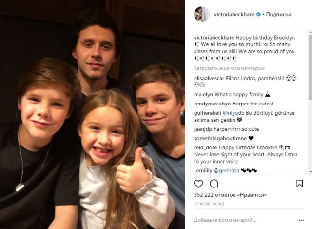 А вот Вики решила поздравить сына семейным фото, написав: «С Днем Рождения, Бруклин! Мы все так любим тебя!! Целую!! Мы все гордимся тобой».