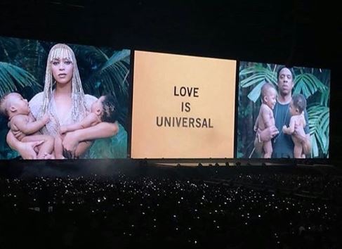 Вчера в Кардиффе стартовал On the Run II Tour Джея Зи (48) и Бейонсе (36). Зрителям, которые были на концерте, посчастливилось первыми увидеть фото, на котором Джей Зи держит в руках малышей Руми и Сэра — его артисты использовали как инсталляцию.