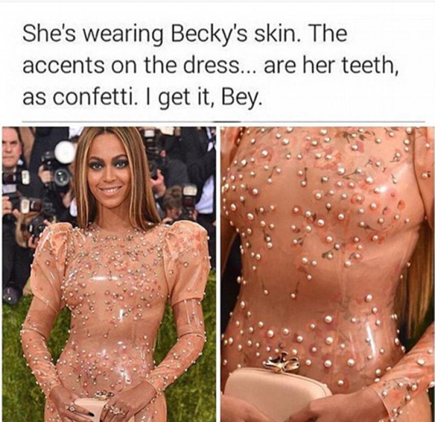 Сразу после появления Бейонсе (34) на красной ковровой дорожке в ее удивительном платье из латекса в Сети появилось множество шуток. И, конечно же, все они были связаны с таинственной разлучницей Бекки, о которой спела звезда в одной из песен со своего нового альбома Lemonade. В один голос фанаты утверждали, что наряд звезды — не что иное, как кожа той самой Бекки, а украшения на нем — это ее зубы.