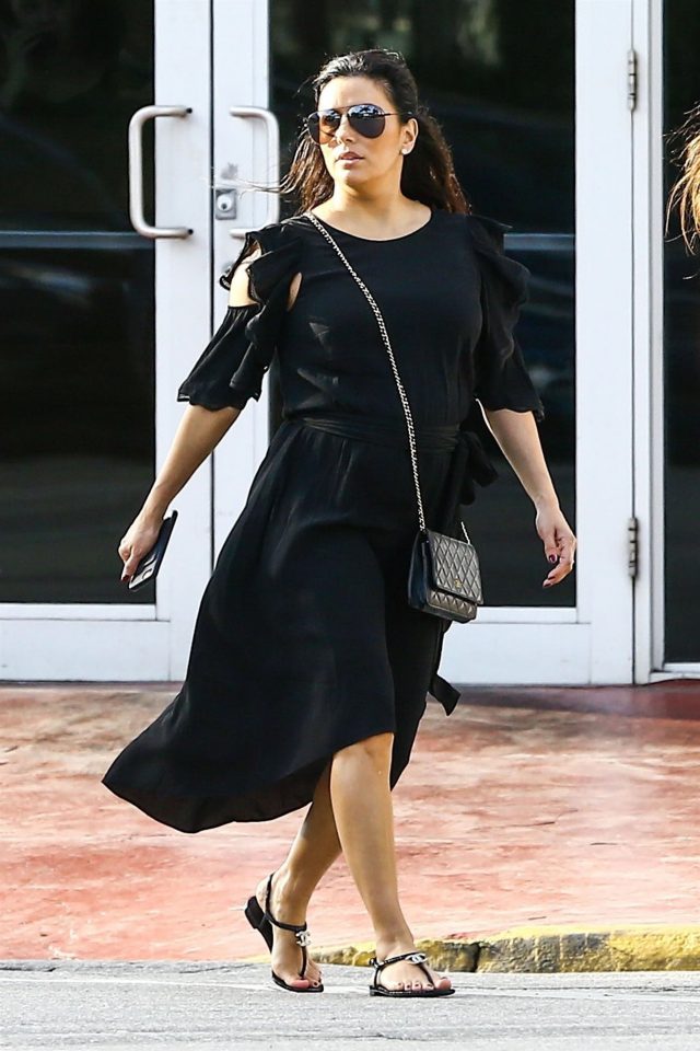 Сейчас Лонгория все время проводит с мужем Хосе Бостоном (49). Недавно они отправились в круиз на яхте, а теперь отдыхают в Майами. В этот раз Ева снова попыталась скрыть живот, надев черное платье с поясом, но мы то уже все видели.