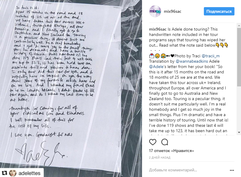 Две недели назад певица Адель (29) шокировала фанатов печальной новостью – она отменила два последних концерта тура в поддержку альбома «25», которые должны были пройти в Лондоне. Дело в том, что у певицы серьезно повреждены связки. «Простите. Простите за ваше разочарование. Простите за вечера с вашими дорогими людьми, которые могли бы оставить столько приятных совместных воспоминаний. Простите за ваши время и деньги, которые вы потратили, организовывая поездки. Вы знаете, что я не смогла бы принять такое решение с легкостью. Я выступила на 121 шоу, и мне осталось всего два», — извинилась Адель перед фанатами в своем Facebook.