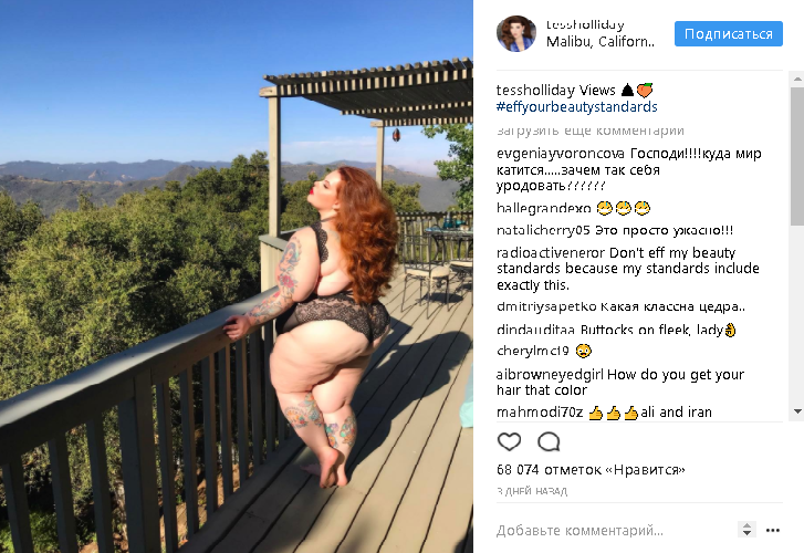 На днях самая полная модель в мире Тесс Холлидей (31) выложила откровенную фотографию в свой Instagram. Девушка в кружевном белье наслаждается видом с балкона квартиры в Малибу!