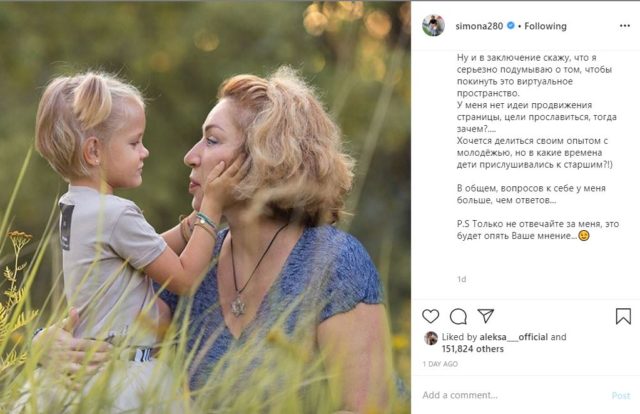 На днях мама Тимати Симона Юнусова (60) выложила в Instagram пост, в котором призналась, что, возможно, закроет страницу в социальной сети: «Я серьезно подумываю о том, чтобы покинуть это виртуальное пространство. У меня нет идеи продвижения страницы, цели прославиться, тогда зачем?…. Хочется делиться своим опытом с молодёжью, но в какие времена дети прислушивались к старшим».