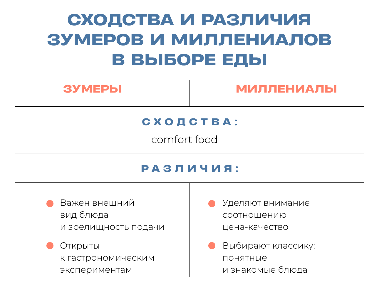 Получается, если миллениалы тяготеют к традиционной еде как источнику насыщения, то зумеры ориентированы на мобильность и оперативность в вопросах питания. К тому же поколение Z ищет «самое лучшее», тем временем Y уделяет серьезное внимание соотношению цена-качество, красота продукта или блюда их интересует в последнюю очередь.