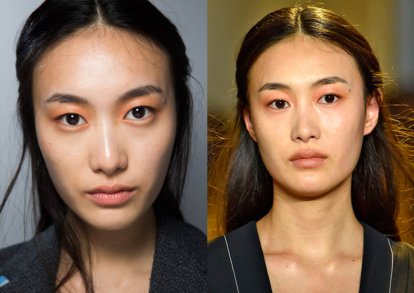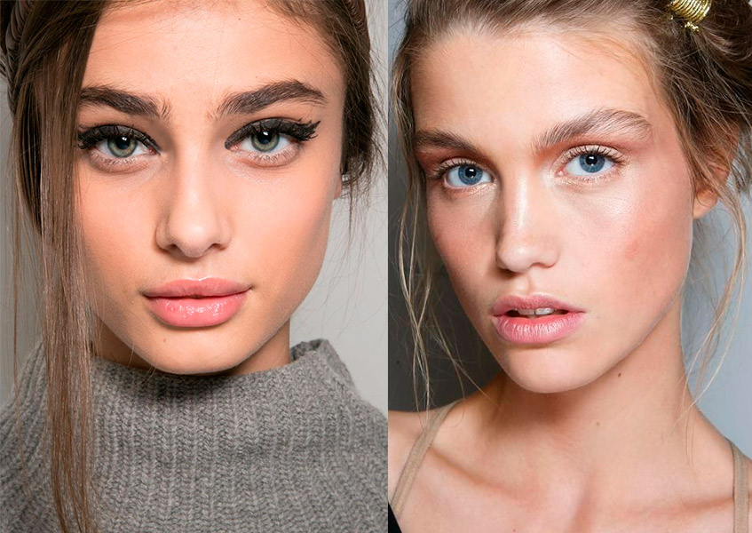 «Макияж без макияжа» в тренде уже много сезонов подряд. Добиться идеальной кожи тебе помогут легкие тональные средства, немного консилера и хайлайтер. Никакого скульптурирования, только естественность. Единственное, что допустимо, – акцент на бровях. Их ты можешь смело зачесать наверх и подчеркнуть коричневыми тенями или карандашом.