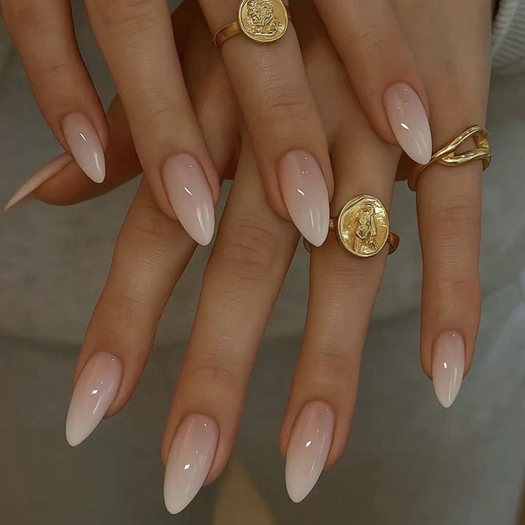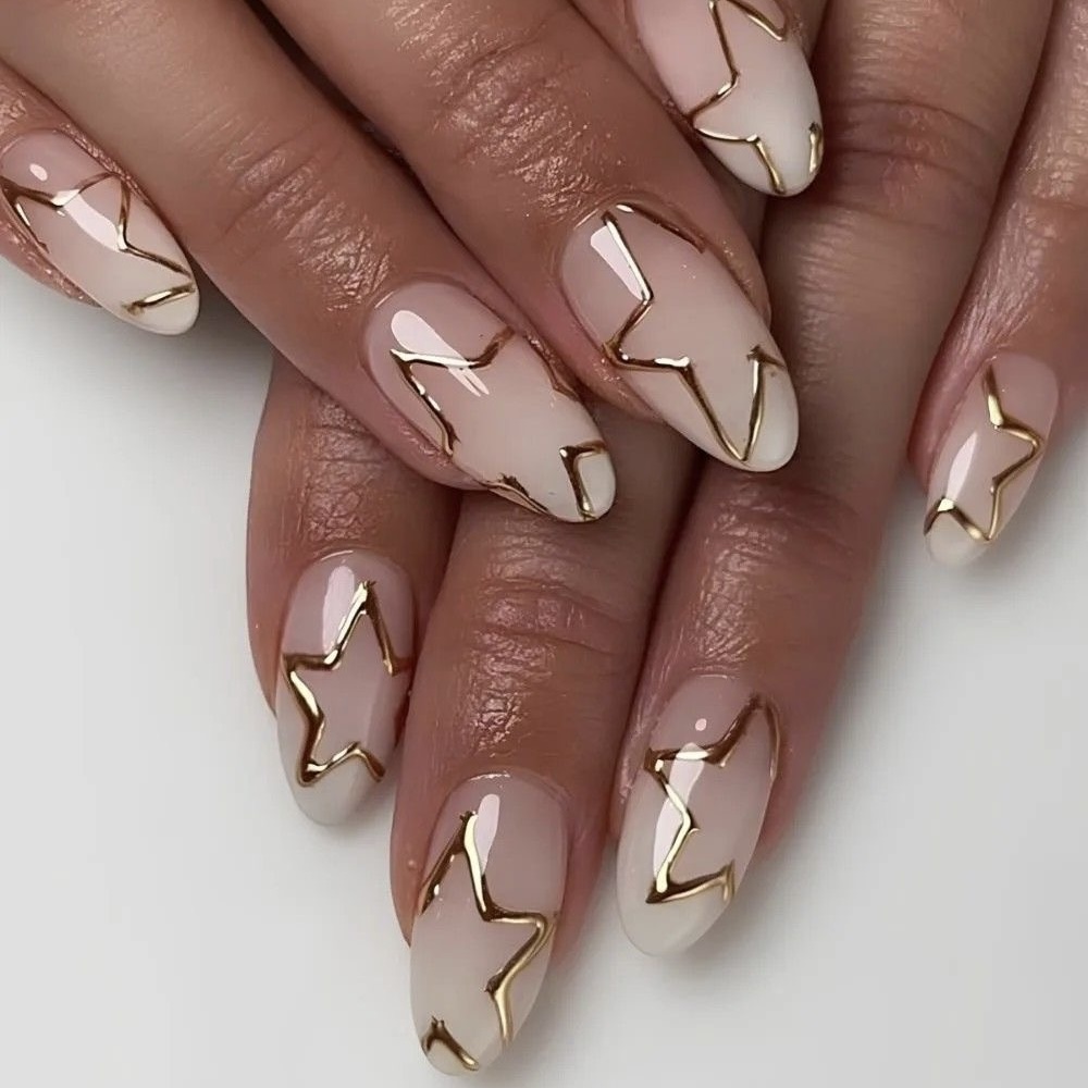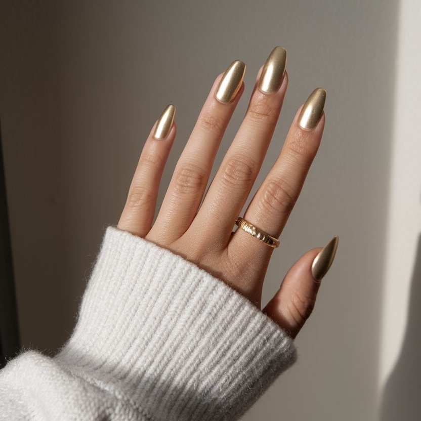 – Металлик, шампань или золото. Нюд в сочетании с одним ногтем, покрытым в оттенок шампань, или тонкие золотые линии.