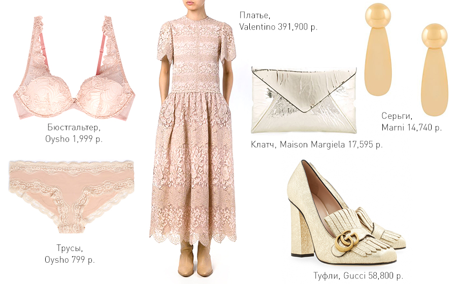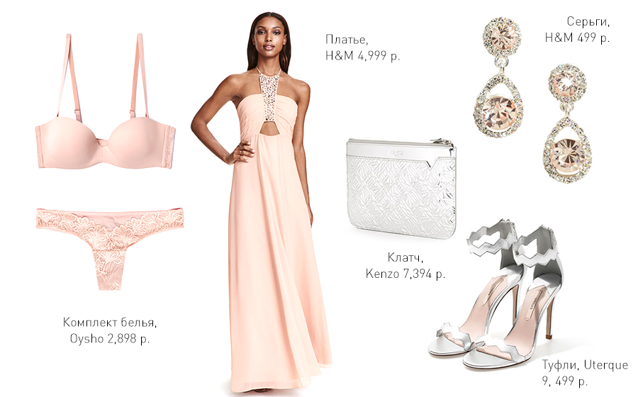 К середине лета твоя кожа приобретет золотистый оттенок, и нежно-розовое платье будет прекрасно на тебе смотреться. Образ дополнят серебряный клатч Kenzo, который ты можешь купить на Farfetch с хорошей скидкой, босоножки Uterque и серьги H&M. Ну и, конечно, нельзя забывать о белье. Комплект из Oysho идеально подойдет под это платье. Более того, у бюстгальтера отстегиваются лямки, поэтому его совсем не будет видно.