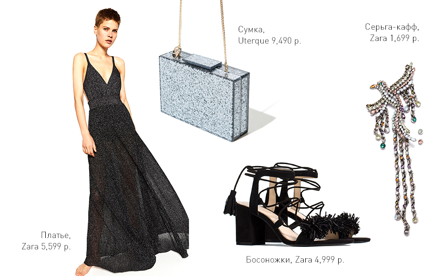 Камни, блестки, люрекс… В общем, на выпускном ты будешь блистать. Спеши в Zara, ведь платье выпущено ограниченным тиражом. Там же смело покупай этот прекрасный кафф в виде птицы и босоножки на завязках. А сверкающая сумка из Uterque дополнит твой образ.
