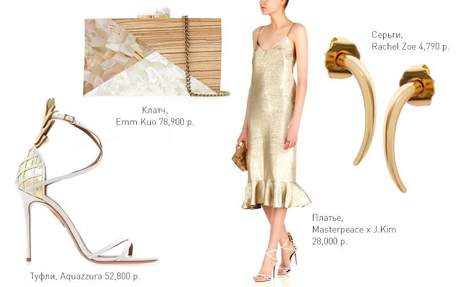Золотое платье Masterpeace x J.Kim также идеально подойдет для выпускного. Наденешь туфли Aquazzura, серьги Rachel Zoe и возьмешь с собой клатч Emm Kuo – и твои друзья не забудут тебя до ближайшей встречи одноклассников.