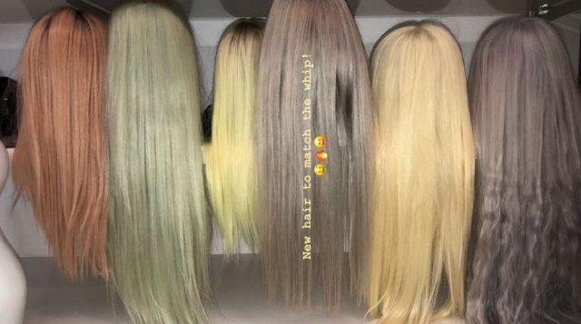 Но это еще не все. Позже Кардашьян показала коллекцию своих новых париков, которые она приобрела «чтобы подходить к машине»: два — пепельного оттенка, один — бледно-желтого и парочка неоновых.