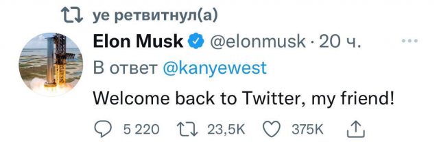 Но Йе решил продолжить в Twitter. Он выложил совместную фотографию с Марком Цукербергом, подписав, что он был ему хорошим другом до блокировки. Но, кажется, что теперь у него новый товарищ: рэпера тут же поприветствовал Илон Маск.