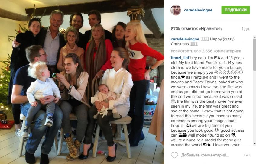 12 декабря Кара опубликовала в своем Instagram снимок, на котором запечатлена вся семья модели и ее возлюбленная. Судя по всему, родным Кары Энни пришлась по душе. На фотографии отец актрисы -Чарльз – крепко обнимает Энни и при этом весело смеется.