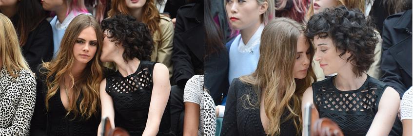21 сентября в рамках Недели Моды в Лондоне прошел показ новой коллекцииBurberry Prorsum. Места в первом ряду заняли самые почетные гости. В их числе былиКейт Мосс (41), Бенедикт Камбербетч (39) с супругойСофи Хантер (37), Елена Перминова (29), а такжеКара Делевинь (23) в компании своей возлюбленной Энни Кларк (32). Именно эта сладкая парочка и привлекла внимание фотографов.
