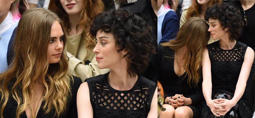21 сентября в рамках Недели Моды в Лондоне прошел показ новой коллекцииBurberry Prorsum. Места в первом ряду заняли самые почетные гости. В их числе былиКейт Мосс (41), Бенедикт Камбербетч (39) с супругойСофи Хантер (37), Елена Перминова (29), а такжеКара Делевинь (23) в компании своей возлюбленной Энни Кларк (32). Именно эта сладкая парочка и привлекла внимание фотографов.