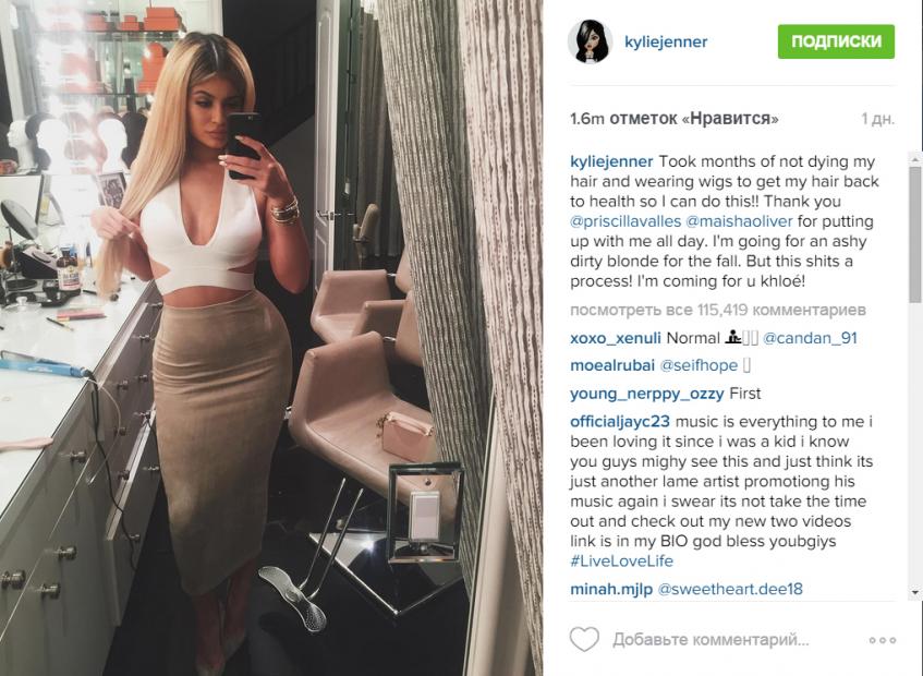 2 сентября Кайли опубликовала в Instagram фото, на котором предстала перед поклонниками блондинкой. «Несколько месяцев я не красила волосы и носила парики, чтобы вернуть здоровье своим волосам, дабы я смогла сделать это,– написала под фотографией Кайли. – Я буду пепельной блондинкой этой осенью. Но это заняло очень много времени!»
