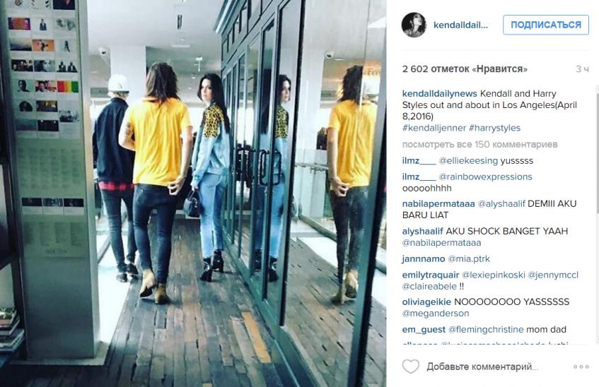 8 апреля кто-то из друзей Кендалл опубликовал в Instagram фото, на котором модель и певец мирно прогуливались по магазинам: Кендалл, одетая в туфли на высоком каблуке, синие джинсы и джинсовую куртку, вышагивает рядом с Гарри, который появился в обтягивающих черных штанах и желтой футболке.
