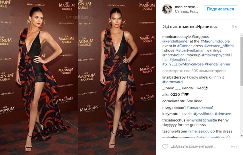 Хоть мы и не застали Кендалл на основном открытии фестиваля, девушка решила порадовать поклонников шикарным нарядом, появившись вечером 12 мая на пляжной вечеринке Magnum. Она вышла в свет в длинном легком платье от Versace, которое прекрасно подчеркивало ее великолепную фигуру.
