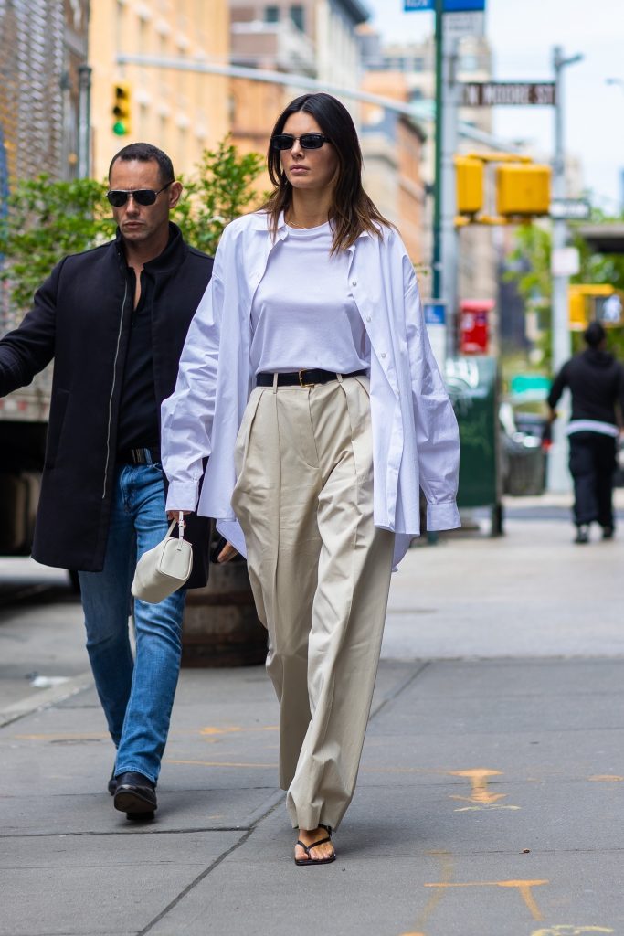 Продолжаем вдохновляться образами звезд и составлять базовый гардероб на осень. И если с ярким пальто, оверсайз тоутом и высокими сапогами мы уже определились, то пришло время решить вопрос с брюками. Мы советуем обратить внимание на бежевый вариант, как у Кендалл Дженнер и Роузи Хантингтон-Уайтли. Звезды выбирают модель из коллекции The Row и стилизуют ее с базовой белой футболкой и свободной рубашкой.