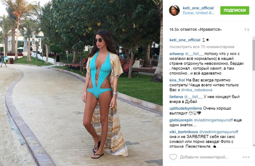 30 ноября Кети опубликовала фото, на котором она предстала в бирюзовом купальнике, который великолепно подчеркивал ее фигуру. Также певица накинула легкий яркий халат.