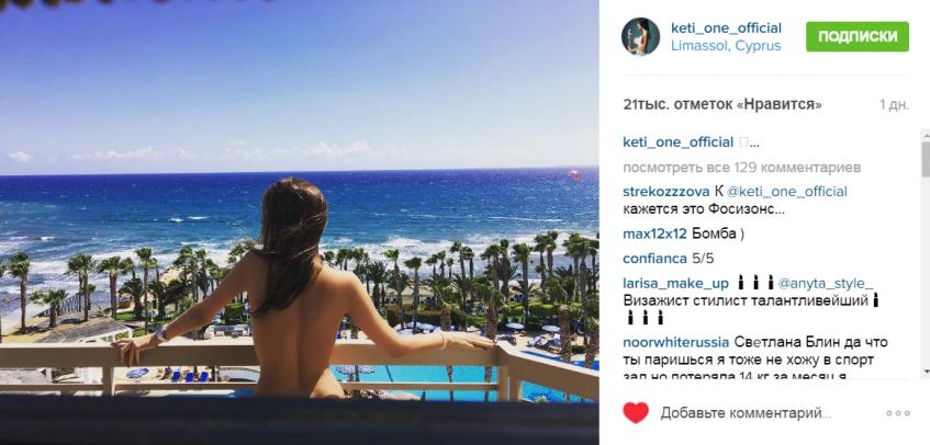 На днях вокалистка группы «А-Студио» опубликовала в своем Instagram фото, которое вызвало бурный восторг у ее подписчиков. Как и многие другие звезды, сейчас Кэти отдыхает у моря, поэтому и решилась сфотографироваться обнаженной, продемонстрировав, правда, лишь загорелую спину.