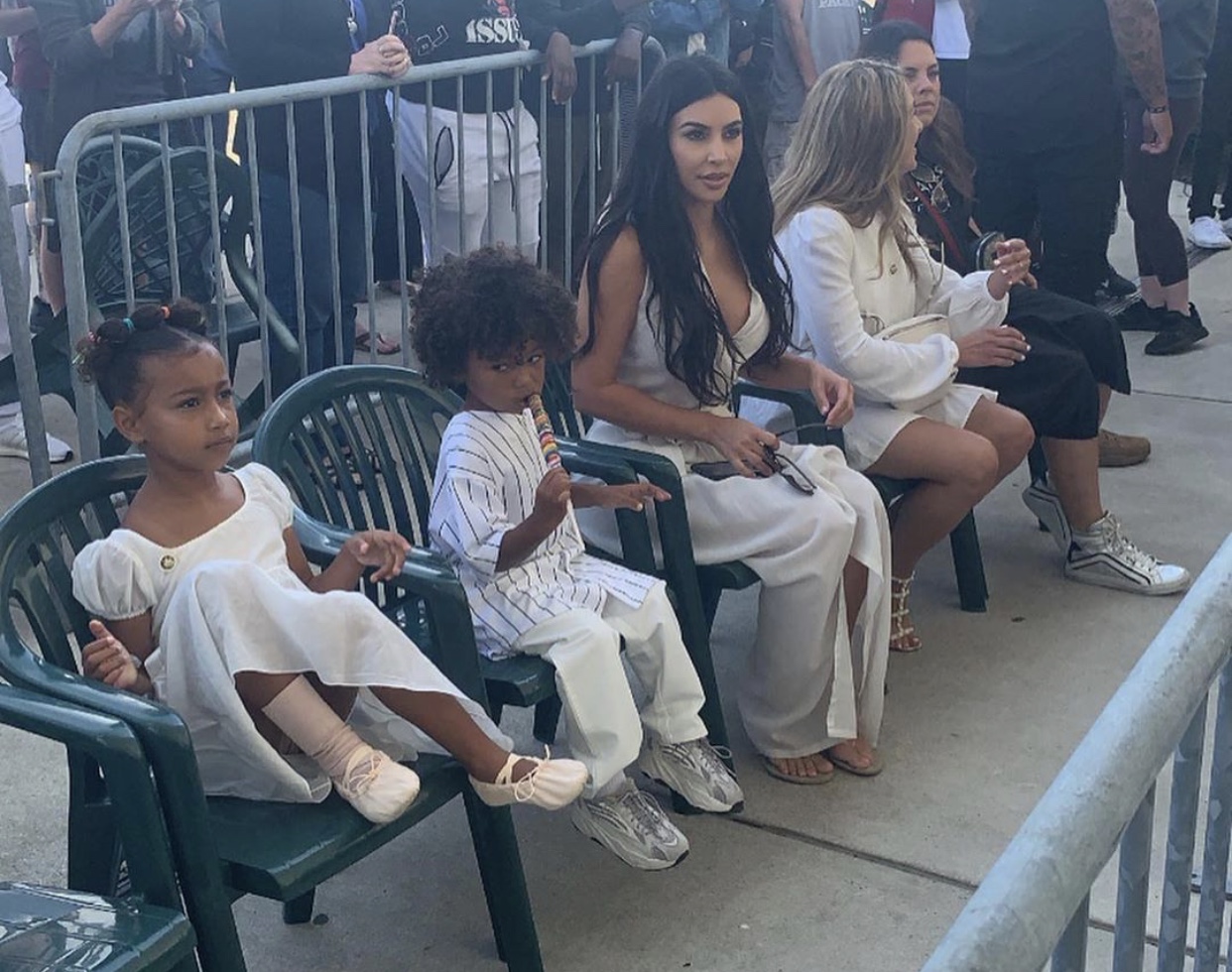 Вчера звезд вместе с детьми засняли в Огайо, где рэпер провел выступление, посвященное жертвам стрельбы 4 августа. Ким, Сейнт и Норт были в белых нарядах и сидели на стульях в первом ряду у сцены. А вот Канье был в черной футболке, спортивках и кроссовках Yeezy (тут мы не сомневались).