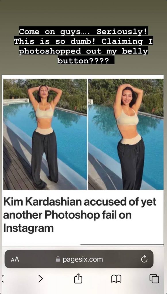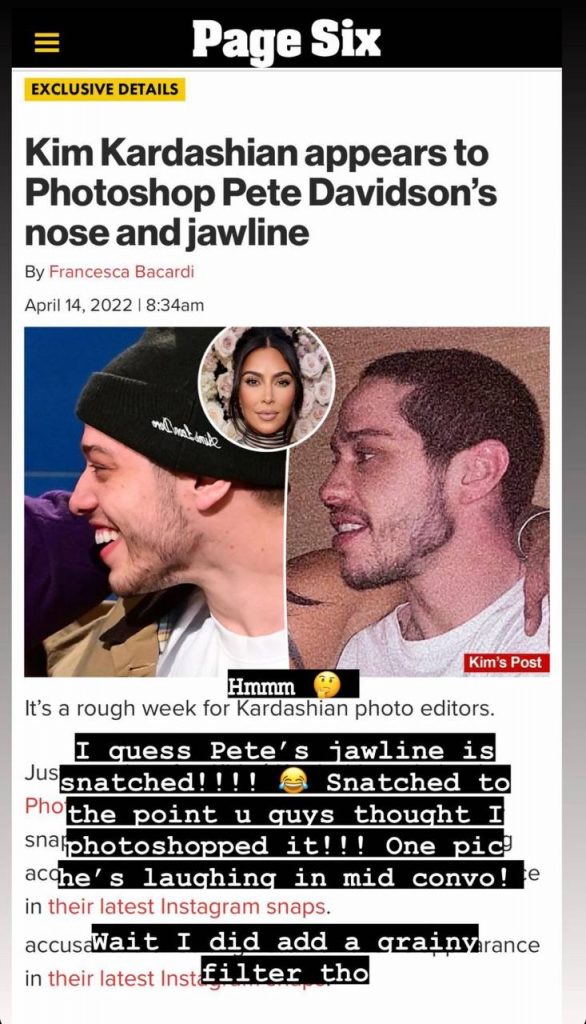 Ким Кардашьян в качестве опровержения опубликовала видео «живых» фото, где она и Пит Дэвидсон совершенно не отличаются от ранее опубликованных снимков. «Как вы предполагаете, что я отредактирую «живое» фото? Ребята, вы серьезно вообще? Вы думаете, что я буду маскировать свой пупок? А если вам, например, вдруг не нравится ваш пупок, то вы можете также закрыть его бельем на очень высокой посадке моего бренда SKIMS!» — написала Ким.