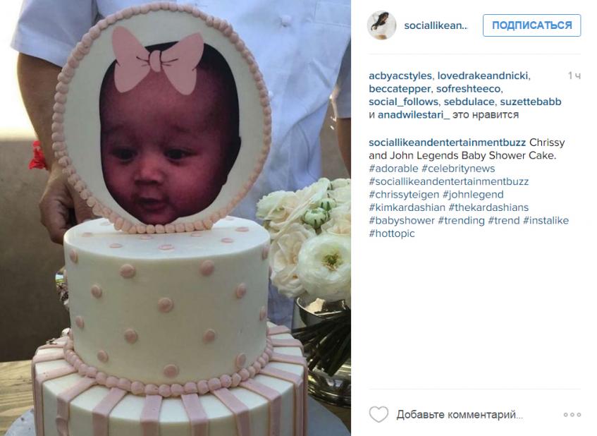 В качестве десерта гостям предложили огромный розовый торт, который украшала фотография Джона в детстве. Таким образом, модель явно хотела намекнуть, что новорожденный малыш будет похож на своего отца.
