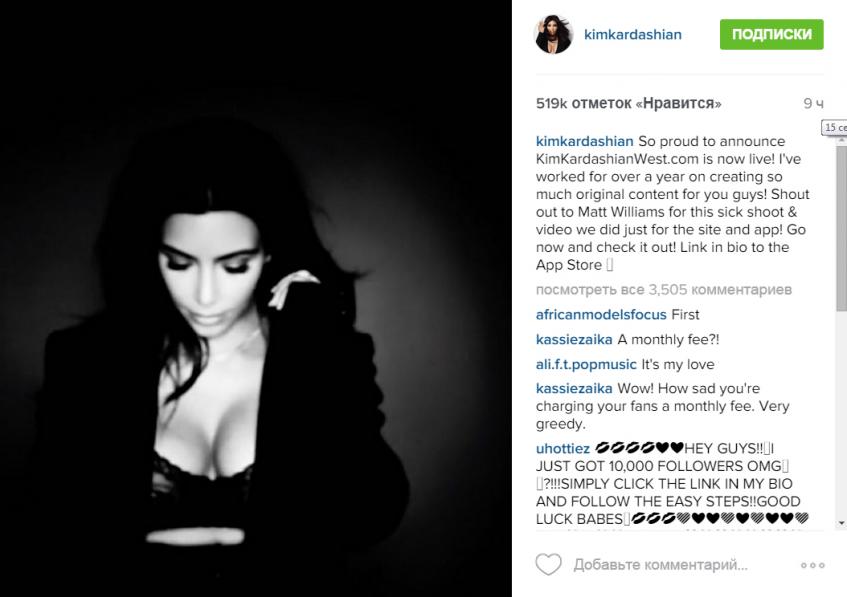 О начале работы нового сайта Ким объявила через свою страничку в Instagram: «Я с гордостью сообщаю, что KimKardashianWest.com начал свою работу! В течение года я собирала очень много оригинального контента для вас, ребята!»