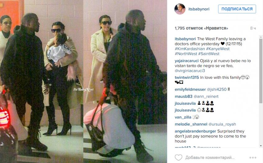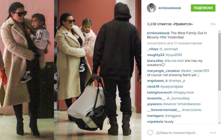 На днях папарацци застали Ким и Канье, когда те вышли на прогулку со своей старшей дочерью Норт (2) и новорожденным Сейнтом. Ким, одетая в бежевое пальто, черные брюки, кофту и сапоги, несла дочку и шла за Канье, который и нес люльку с малышом.