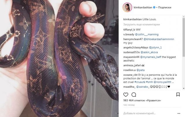 Только что Ким выставила на своей страничке маленькую змею с логотипом бренда Louis Vuitton и подписала фото: «Маленький Луи». Многочисленные фолловеры Ким начали атаковать ее комментариями. Кто-то обвинил Кардашьян в жестоком обращении с животными (а это, кстати, может привести к ну очень серьезному скандалу), кто-то заявил, что это фотошоп, и написал, что выглядит змея очень круто, а кто-то связал фото с давней враждой мужа Ким Канье (40) с Тейлор Свифт (28), которую все поклонники Ким только змеей и называют.