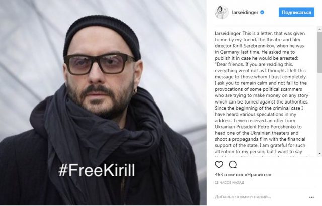 А пока все обсуждают загадочное письмо, которое опубликовал в Instagram немецкий актер Ларс Айдингер (российские зрители знают его по роли императора Николая II в фильме Алексея Учителя «Матильда»). Изначально сообщалось, что письмо написал лично Серебренников и попросил Ларса опубликовать его, если его задержат.